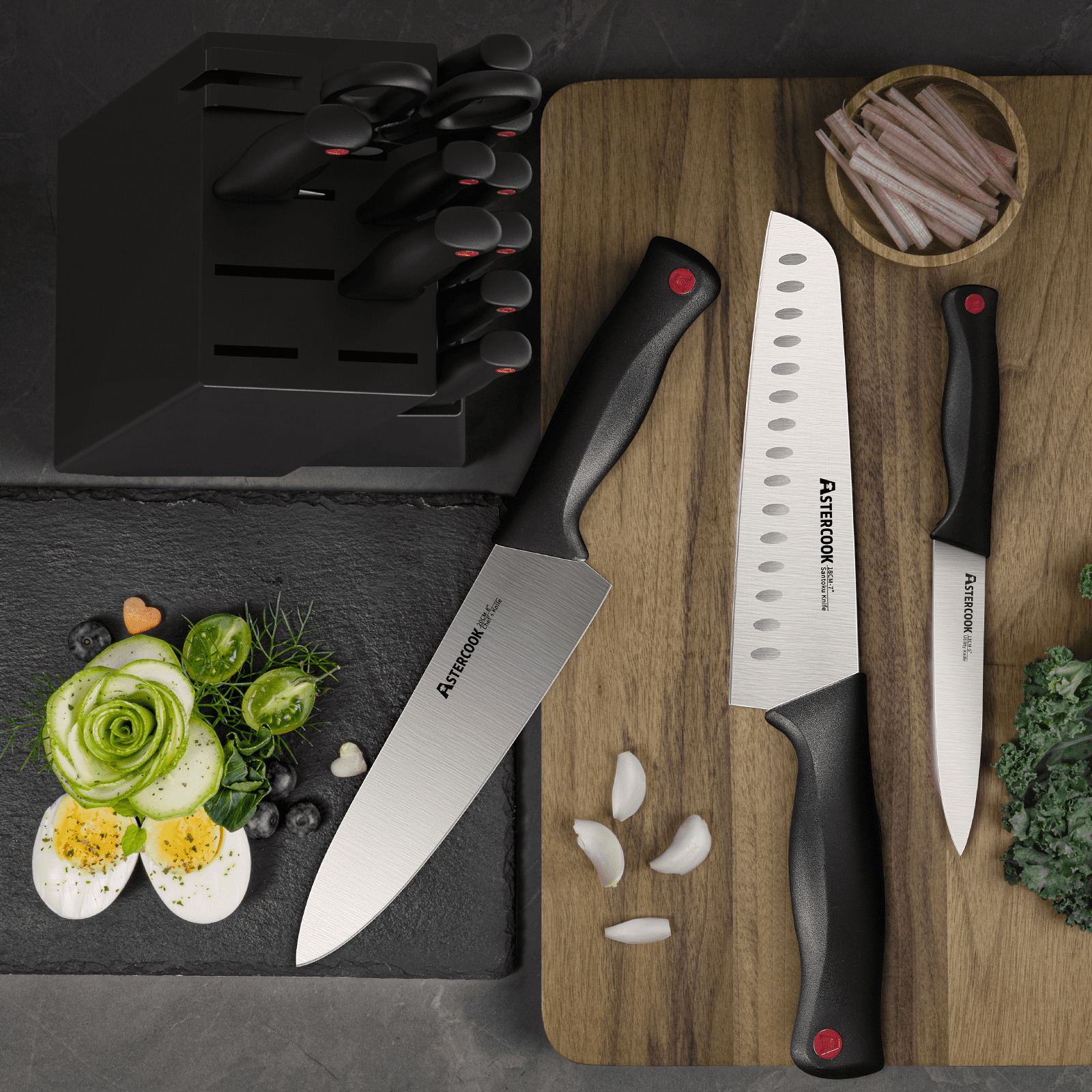Complete 14-Piece Knife Set: This all-in-one set includes: an 8″ Chef knife, 8″ Slicing knife, 7″ Santoku knife, 8″ Serrated bread knife, 5″ Utility knife, 3.5″ Paring knife, six 4.5″ serrated steak knives, kitchen shears, and a black hardwood knife block with a built-in sharpener.