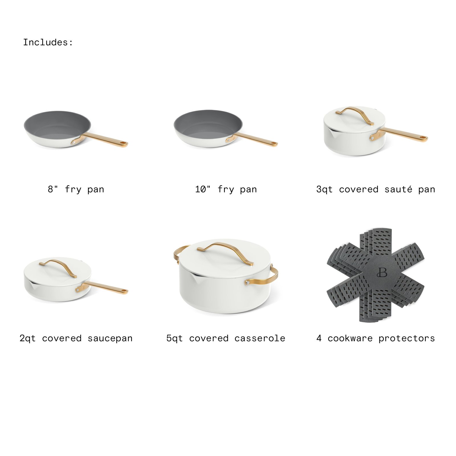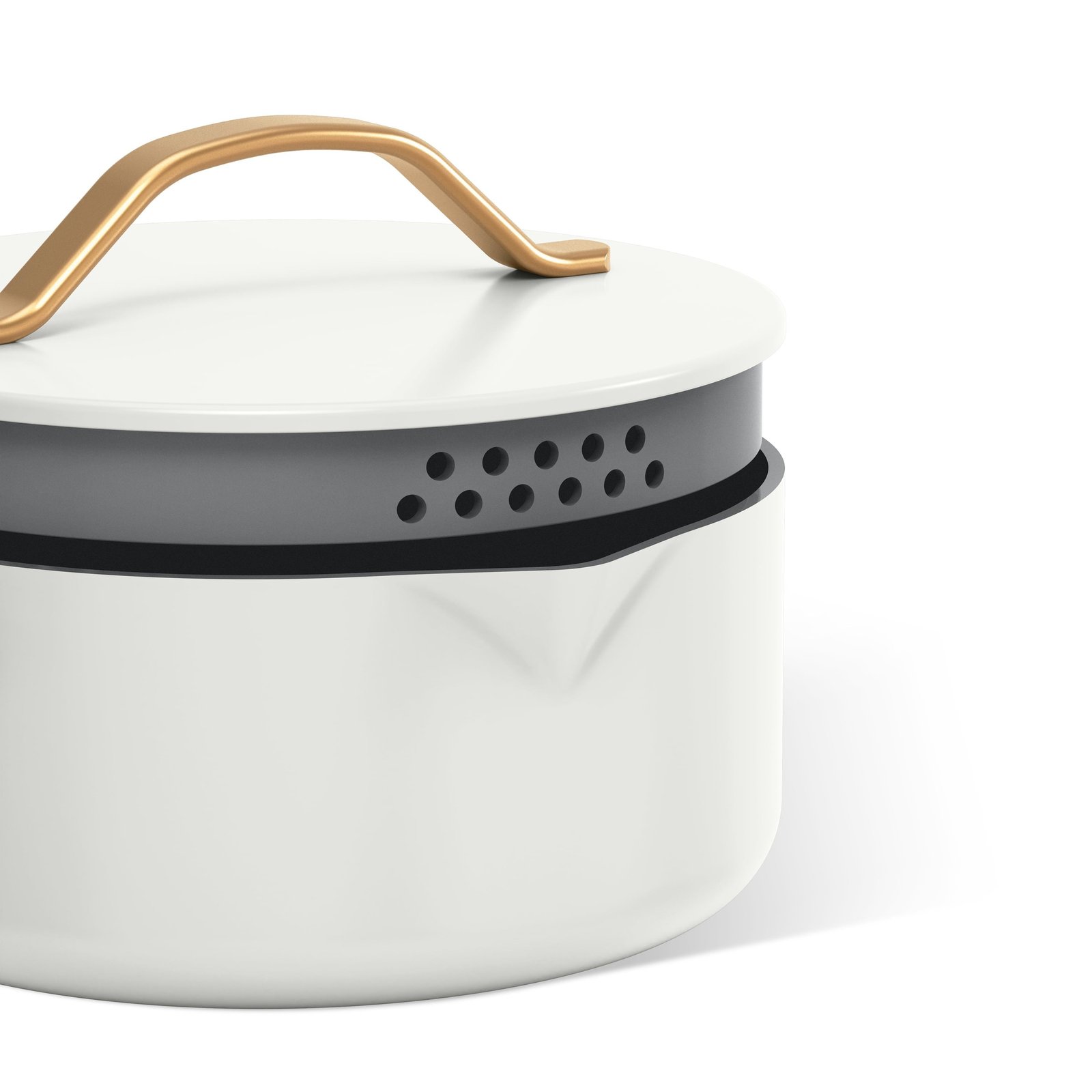 Sophisticated cookware with a thoughtful design? Yes, please. Meet the Beautiful 12-Piece Ceramic Nonstick Cookware Set. Our set includes a 3qt sauté pan, 2qt saucepan and 5qt casserole pan that all come with integrated pour spouts and lids with strainers built right in to minimize messy pours. All the cooking vessels are made with EverGood™ Ceramic Nonstick Coating. The cookware and lids are oven safe to 500°F and compatible with all stovetops—including induction. The pieces are dishwasher safe, we recommend hand washing.
