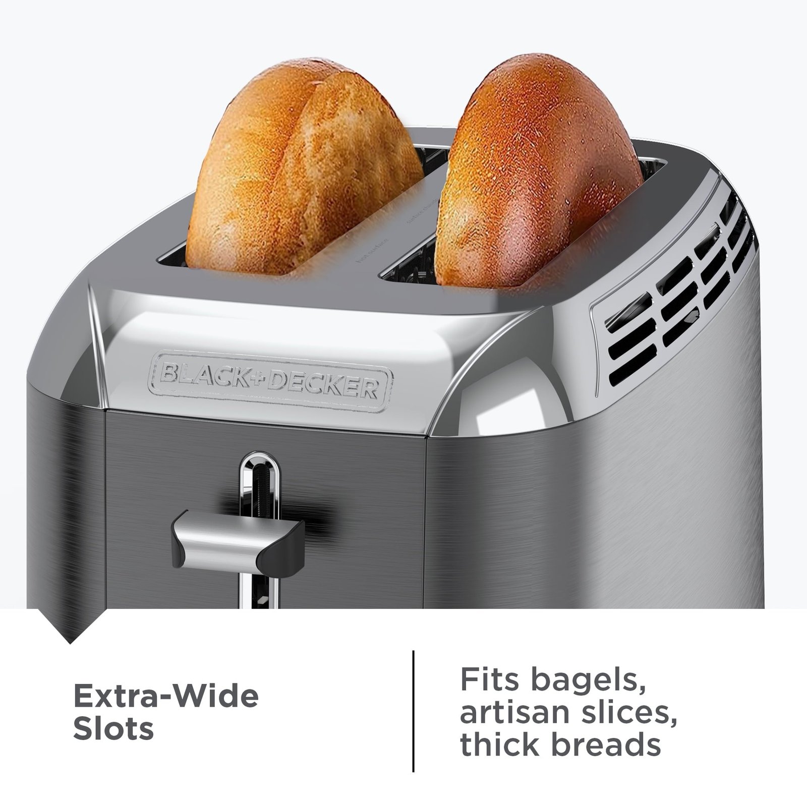 Start your morning with perfectly toasted bread in half the time. The Black+Decker 2-Slice Rapid Toaster is built with Rapid Toast Technology to deliver toasting up to 50% faster than earlier models, so you waste less time waiting. With 7 shade settings and dedicated bagel and frozen functions, you can fine-tune your toast exactly how you like it. The extra-wide slots with self-centering guides adjust to thickness, and the extended lift lever helps you safely retrieve even small slices. Cleanup’s a breeze thanks to the slide-out crumb tray. Wrapped in a sleek black stainless steel exterior, this toaster looks modern and built to last:all without hogging precious counter space.