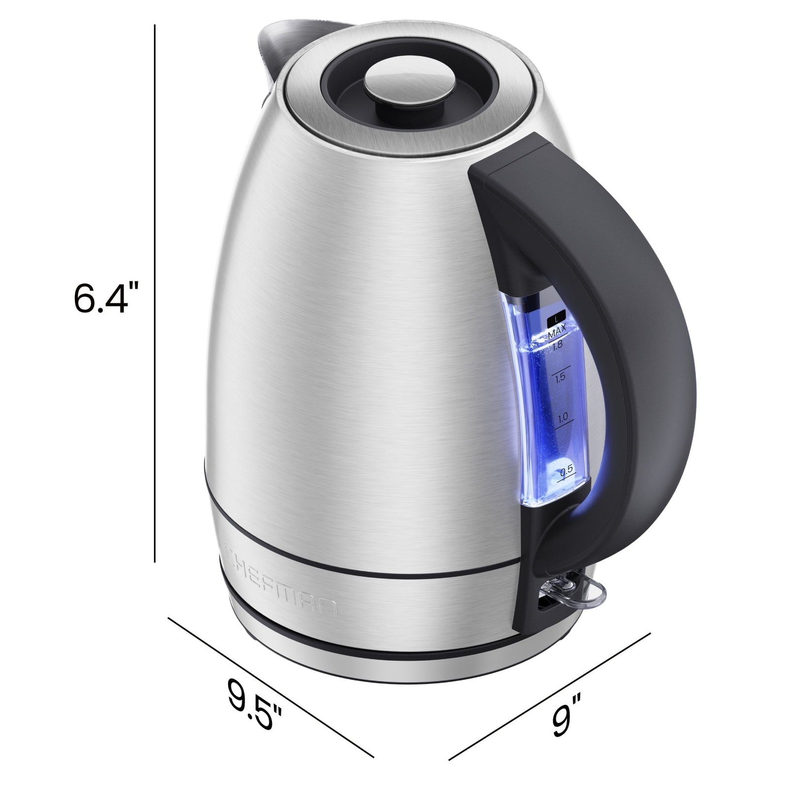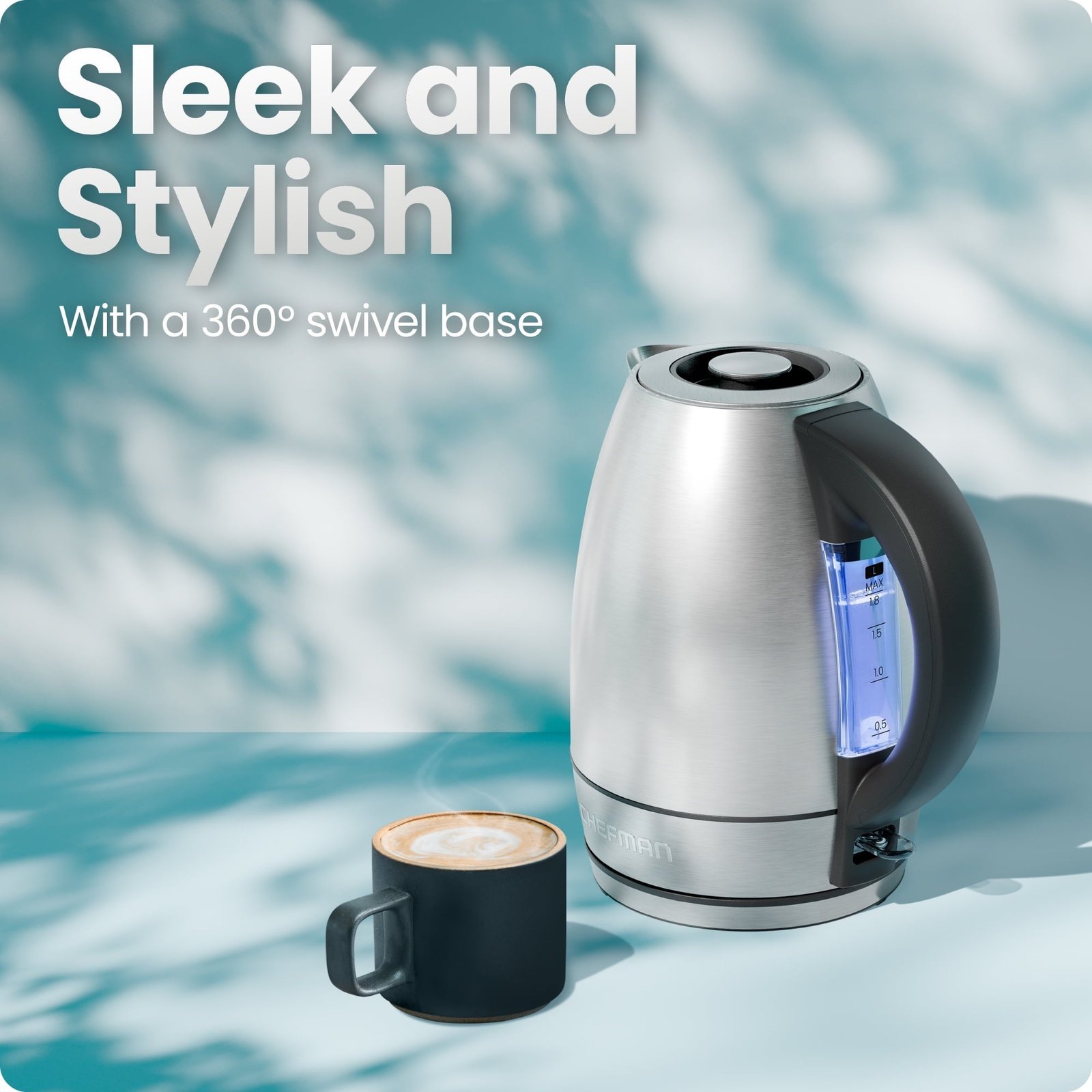 The Chefman Fast-Boil 1.8L Stainless-Steel Kettle heats water fast for hot beverages, soup, ramen, oatmeal, and more! Between heating water in about 3 minutes, LED indicator lights to signal the kettle’s current function, and a fully removable lift-out lid, all you have to do is fill our stainless steel tea kettle with water and let it go to work. The water-level viewing window lets you know how much water is left without needing to look inside, and the cord-free design keeps it portable for easy mobility. The 360-degree swivel base and drip-free spout make pouring easy and mess-free. Enjoy teatime in no time and boil water faster today. Purchase includes a 1-year assurance from Chefman. 1500 Watts/120Volts – RJ11-18-SS New