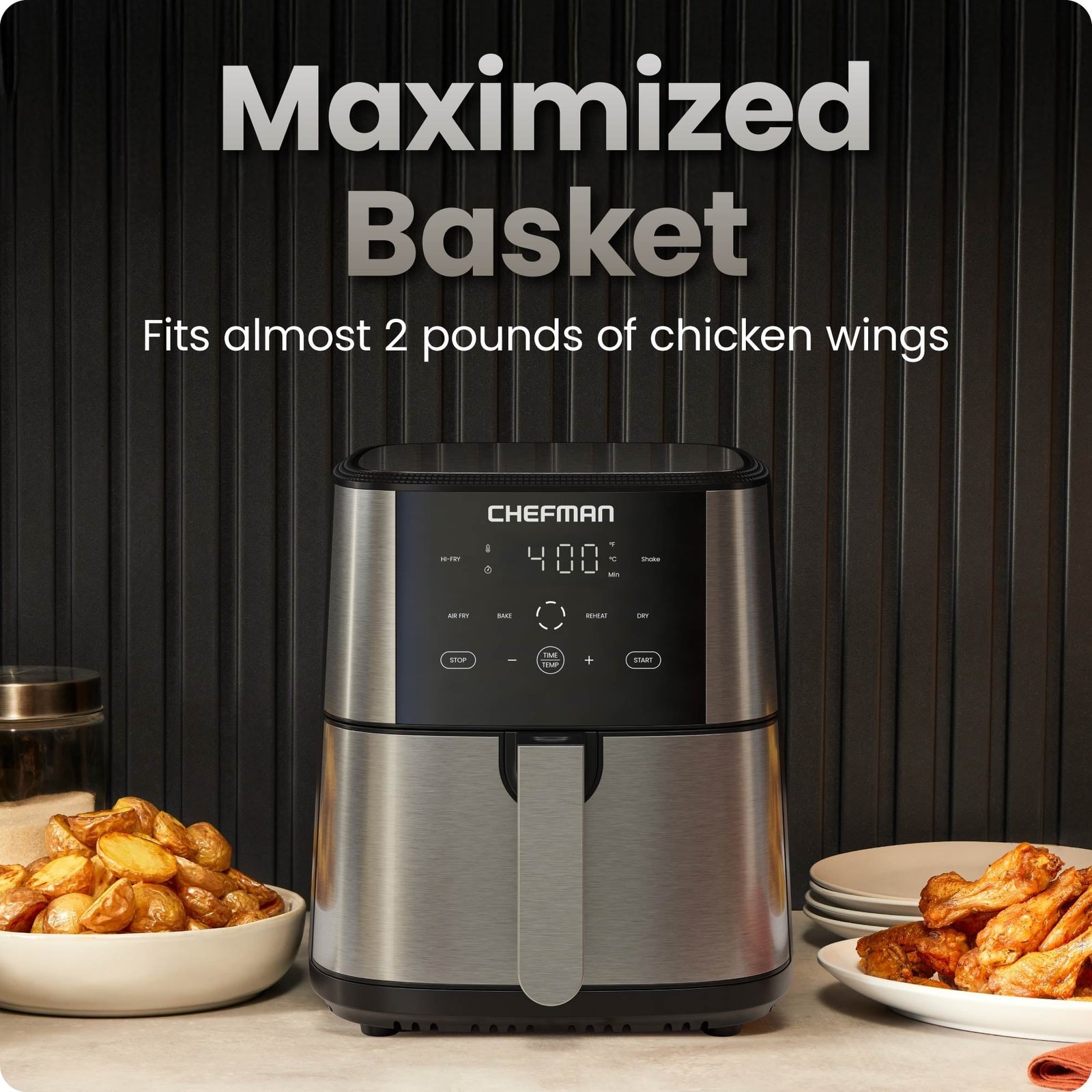Cook up extra crispy meals for your family with the Chefman TurboFry 6-Quart Air Fryer! With powerful convection cooking, the TurboFry air fryer can skip preheating and go right to preparing golden-brown French fries and chicken tenders. Choose from four versatile cooking functions which include Air Fry, Bake, Reheat, or Frozen (which defrosts and fries all in one setting!) It’s easy to program your air fryer with the intuitive touch controls, and automatic shake reminders alert you when to stir or flip your food. Use the innovative HI-FRY button to crank the heat up to 450°F for the last two minutes of cooking, giving your dishes a delicious extra-crispy finish. To help with cleanup, the nonstick basket is top-rack dishwasher safe. Enjoy the crisp without all the guilt with Chefman air fryers. cETL approved with advanced safety technology for long-lasting durability and a 1-year assurance provided by Chefman. 1500W/120V – RJ38-SS-6T New
