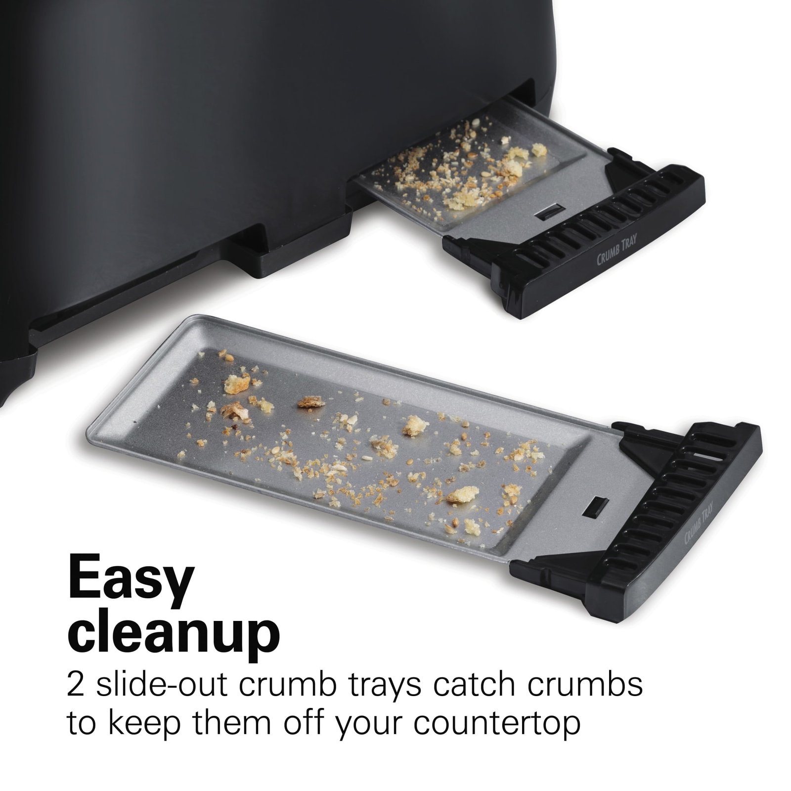 With the Hamilton Beach 4 Slice Toaster with Extra-Wide Slots, you’ll easily toast thicker breads like Texas toast and bagels. Make perfect toast every time to enjoy for snacks or with meals. From bagels and lox for breakfast to open-faced roast beef sandwiches for dinner, you’ll find lots of ways to get creative with toast using this wide-slot toaster. Toast Boost lifts smaller breads higher so they’re easier to retrieve from the toaster. No more struggling to get your toasted English muffins and gluten-free slices from the toaster. With 2 sets of independent controls, this toaster does the job of 2 toasters in 1. It lets you toast different breads, stagger toast start times, and customize the toast shade on each side of the toaster. Choose from 7 toast shades for lighter or darker toast. Press the integrated Cancel button on the shade selector to stop the toasting cycle anytime. This 4 slice toaster has 2 slide-out crumb trays that catch crumbs for easy cleanup. For peace of mind, the toaster automatically shuts off at the end of the toasting cycle, even if toast gets jammed. The cord wrap neatly hides away excess cord and makes storing the toaster easy.