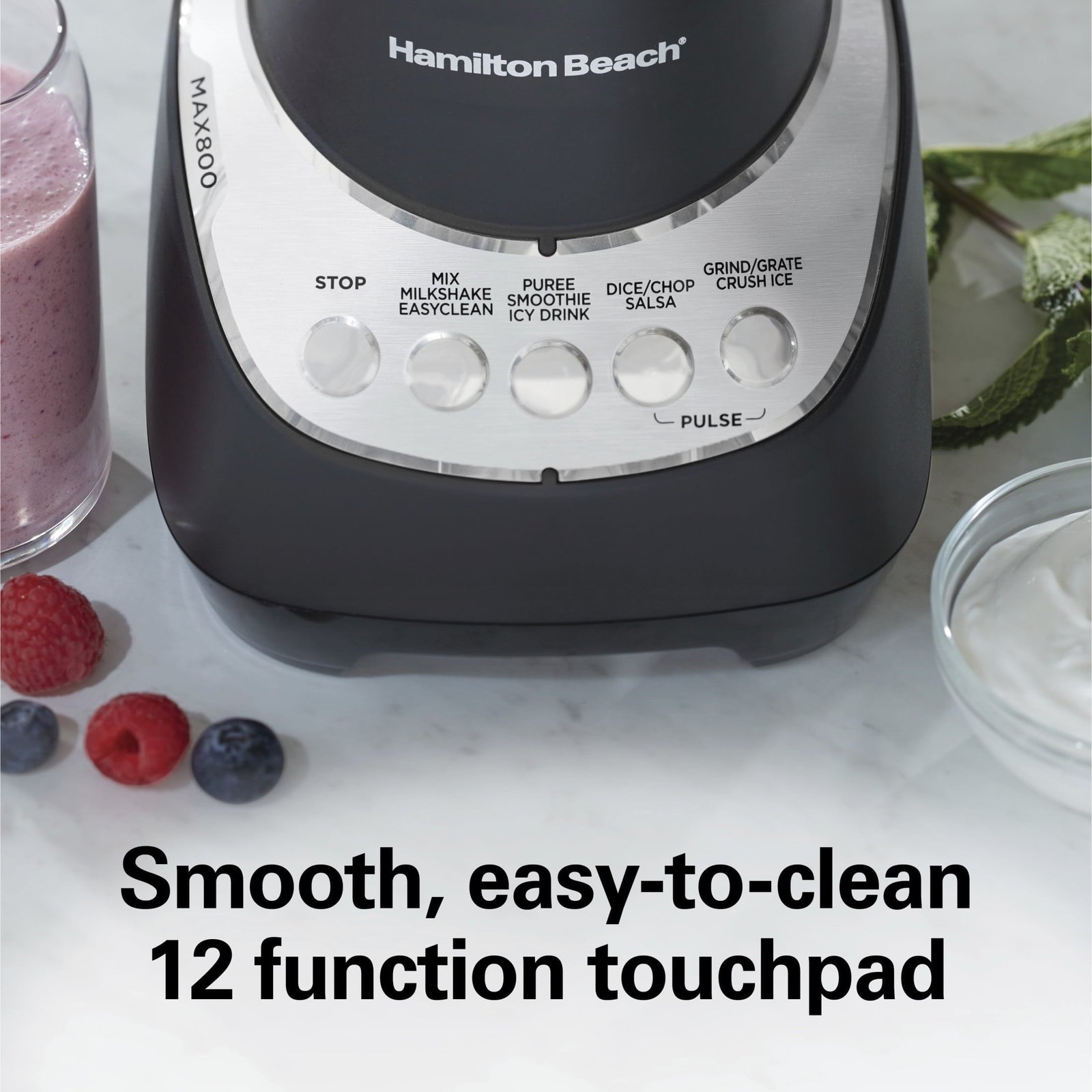 If healthy smoothies, protein shakes, and icy drinks are part of your daily routine, the Hamilton Beach® Wave~Action® Quiet Blender is a must-have kitchen essential. Equipped with ice-crushing stainless steel Ice Sabre® blades and a powerful 800-watt peak motor, it quickly blends even the toughest ingredients for smooth, satisfying results. The patented Wave~Action® System continuously pulls ingredients down into the blades, thoroughly crushing ice, frozen fruit, leafy greens, and more. The 12-function touchpad offers maximum versatility with clearly labeled buttons—no guesswork needed. Built with a quieter blending design, it reduces noise while delivering powerful performance. Perfect for serving family or guests, the 48 oz. shatter-resistant glass jar is both durable and spacious, with a mess-free pour spout to prevent drips. Backed by a 3-year limited warranty, this blender is designed for long-lasting use in any kitchen.