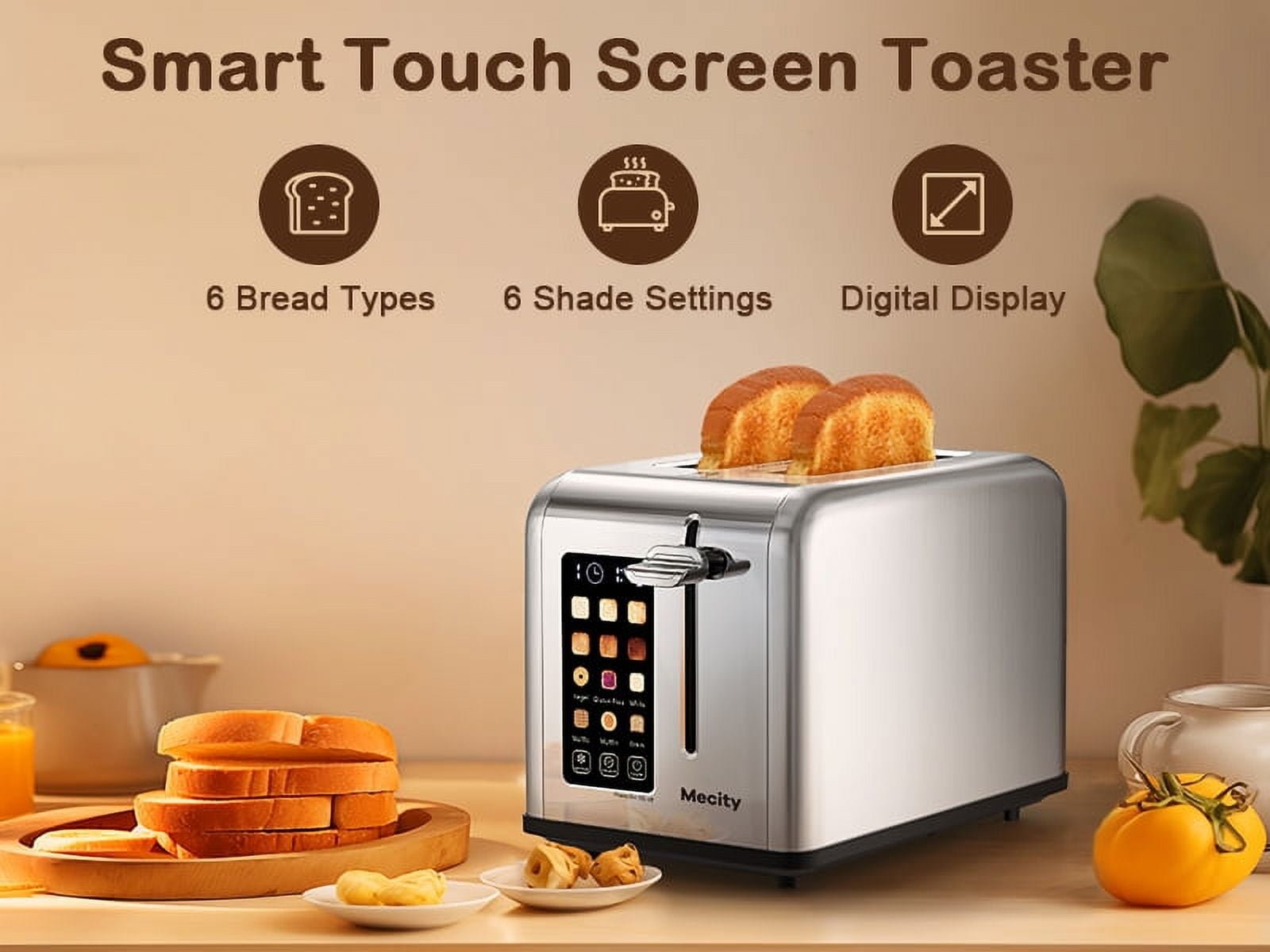 Mecity 2-Slice Touchscreen Toaster, Stainless Steel, 6 Shade Settings, Reheat, Cancel, Defrost, Removable Tray