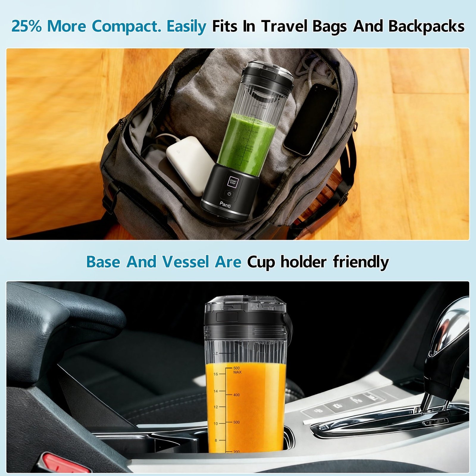 Panti Portable Blender, Cordless, 18oz. USB-C Rechargeable Personal Blender for Shakes & Smoothies, BPA Free, Cover with Handle, USB-C Rechargeable, Dishwasher Safe Parts, Black