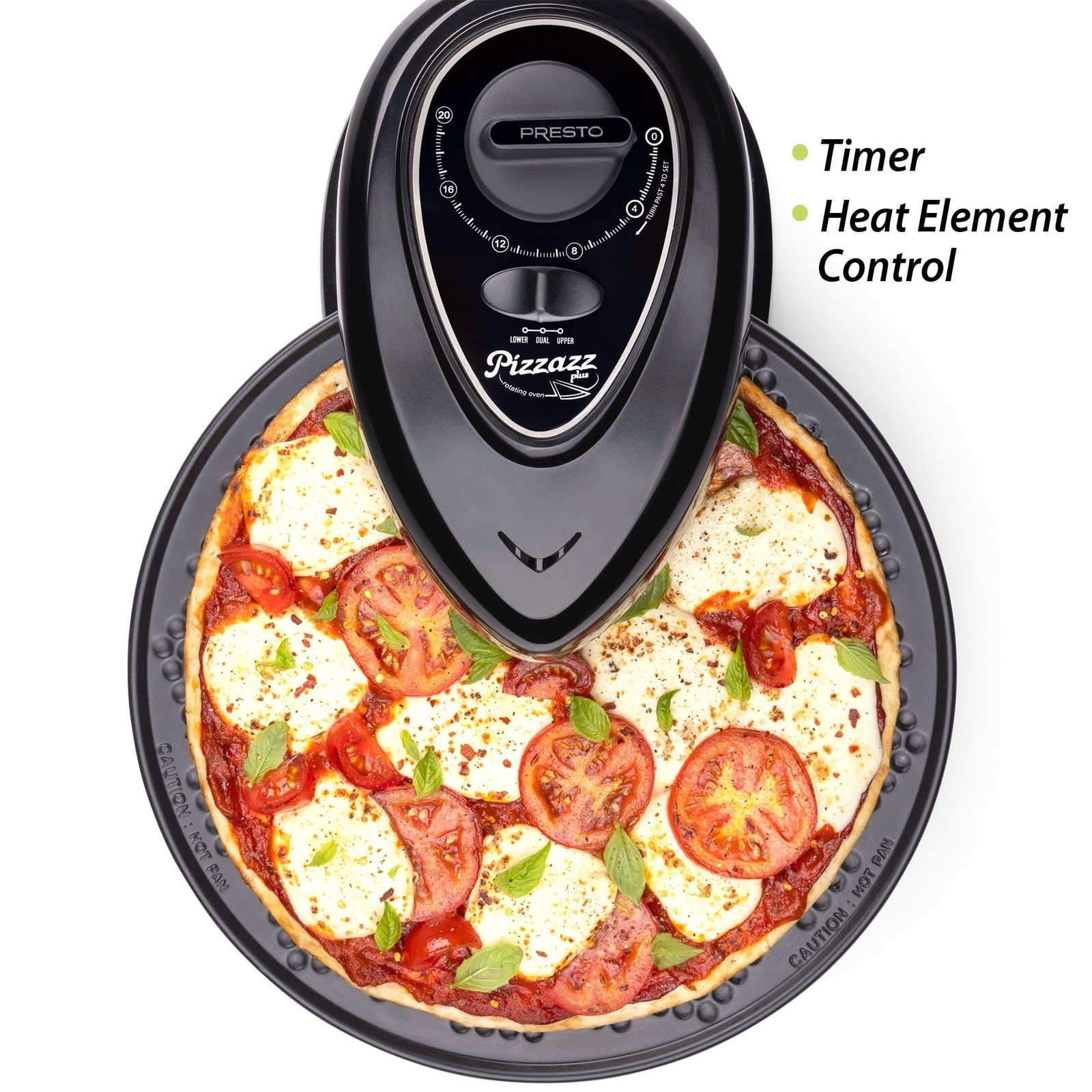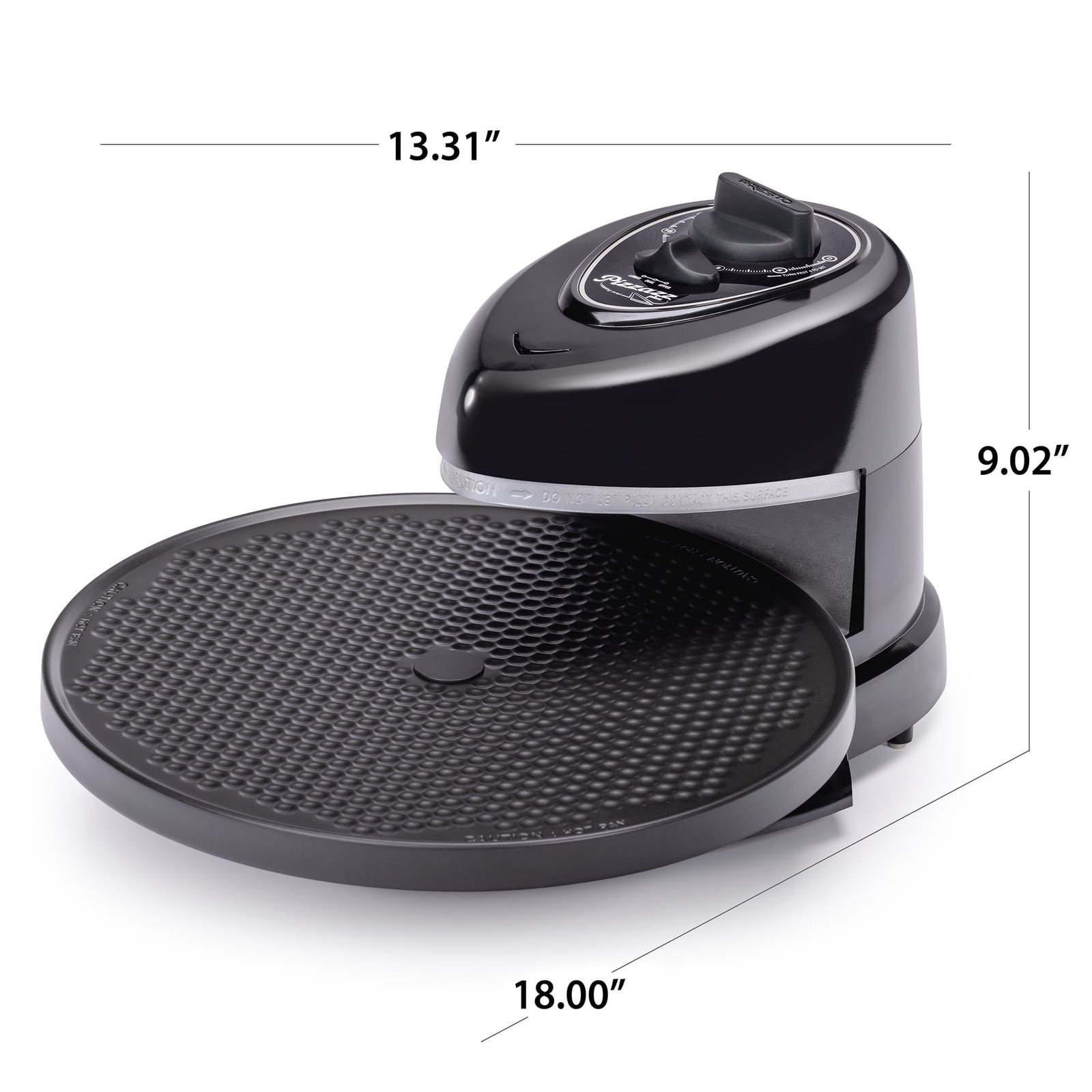 The Presto Pizzazz Plus rotating pizza oven, 03432 Black truly bakes a perfect fresh or frozen pizza. With top and bottom heating elements, it cooks from both sides for fast, uniform cooking. Bake and brown quesadillas, chicken wings, pizza rolls, jalapeño poppers, egg rolls, and other convenience foods without heating up your conventional oven. Pizzazz® Plus starts cooking immediately with no preheat necessary. Features a nonstick baking pan. With separately controlled heating elements you can select top, bottom, or both elements for the results you want every time. The timer will signal the end of cooking time and automatically turn off the heating elements. 13.31” W x 18.00” D x 9.02” H, weight 5.82