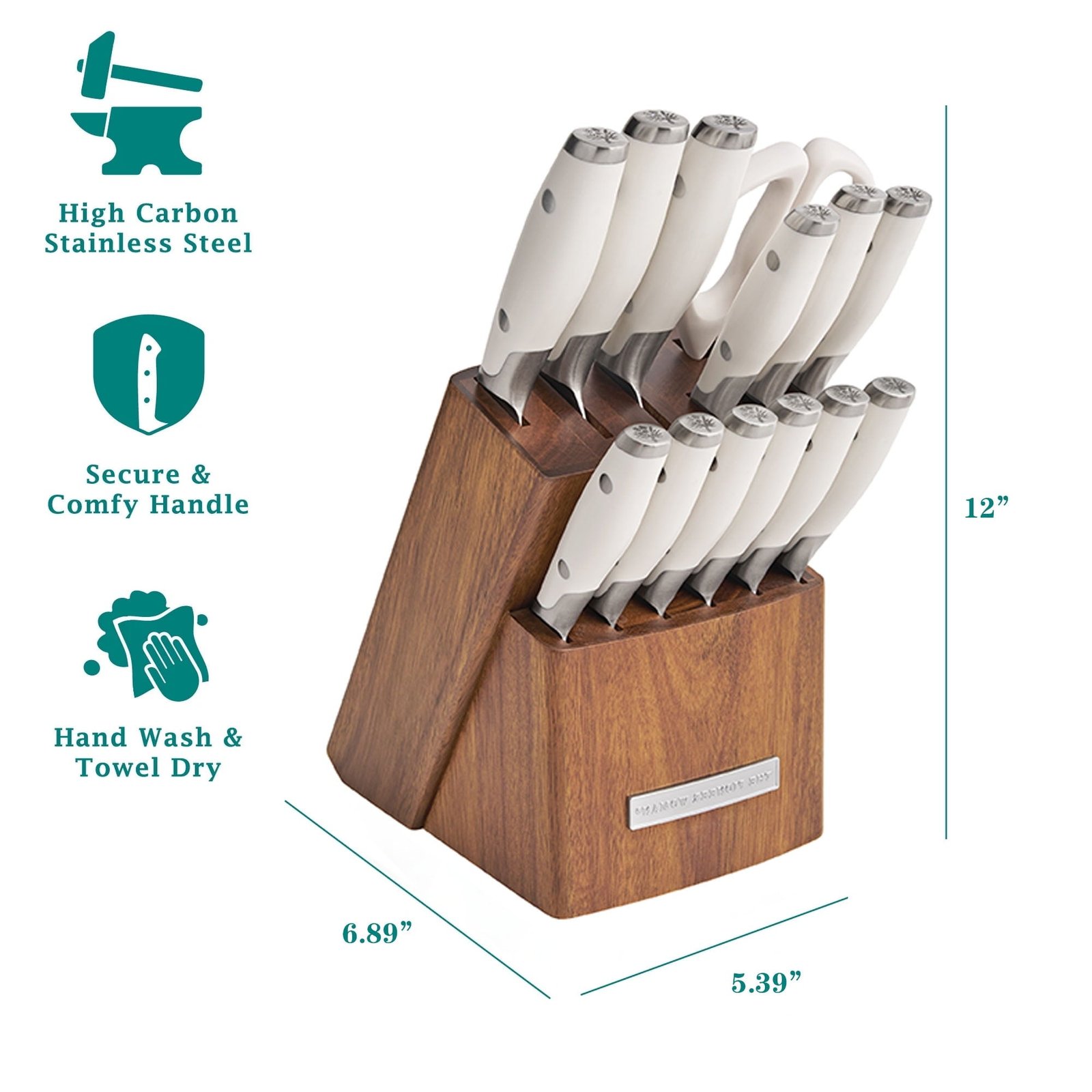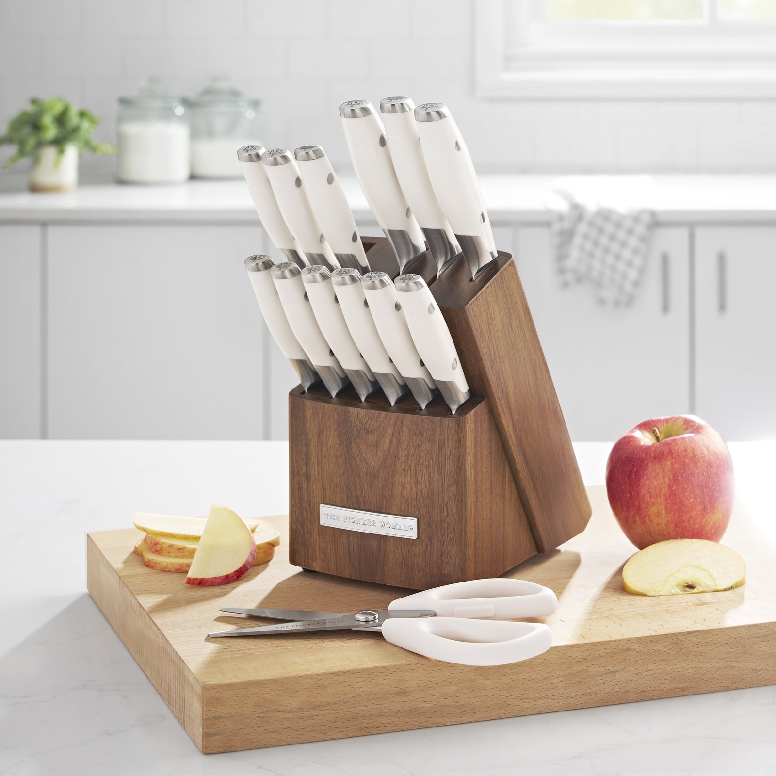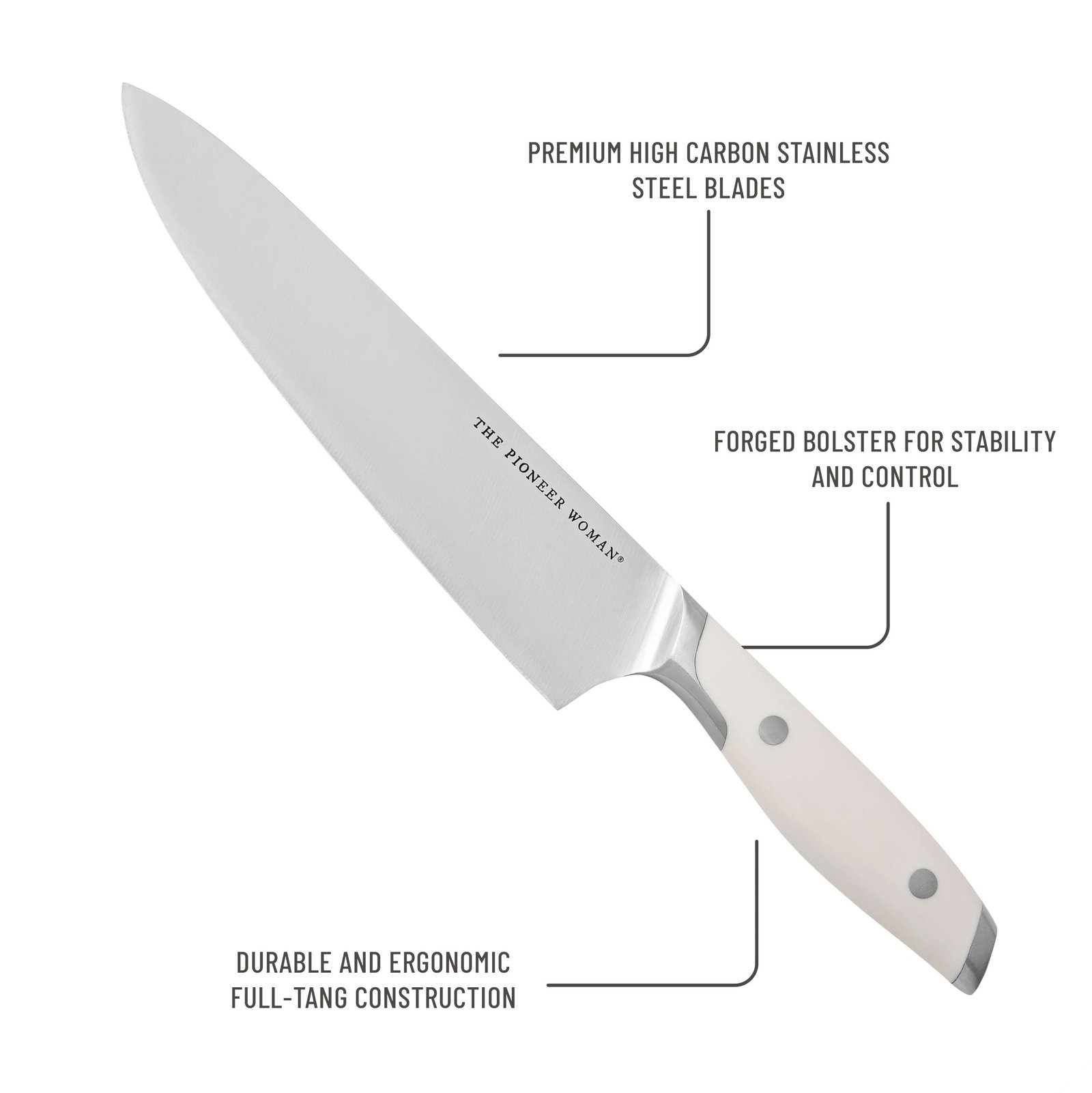 The Pioneer Woman 14-Piece Knife Block Set will quickly become one of your most essential kitchen tools. The set includes a wide variety of knives for every kind of use, including a chef’s knife, bread knife, Nakiri knife, utility knife, paring knife, kitchen shears, bird’s beak knife, and steak knives. Whether you are chopping, cutting, or slicing, you’ll find these knives indispensable. The blades offer the durability of stainless steel and have ergonomically designed handles for comfortable use. After use, we recommend hand washing to extend the life of the blades. The set comes with a beautiful wood block for easy storage. Bring some of Ree’s favorite knives to your home today with The Pioneer Woman 14-Piece Knife Block Set.