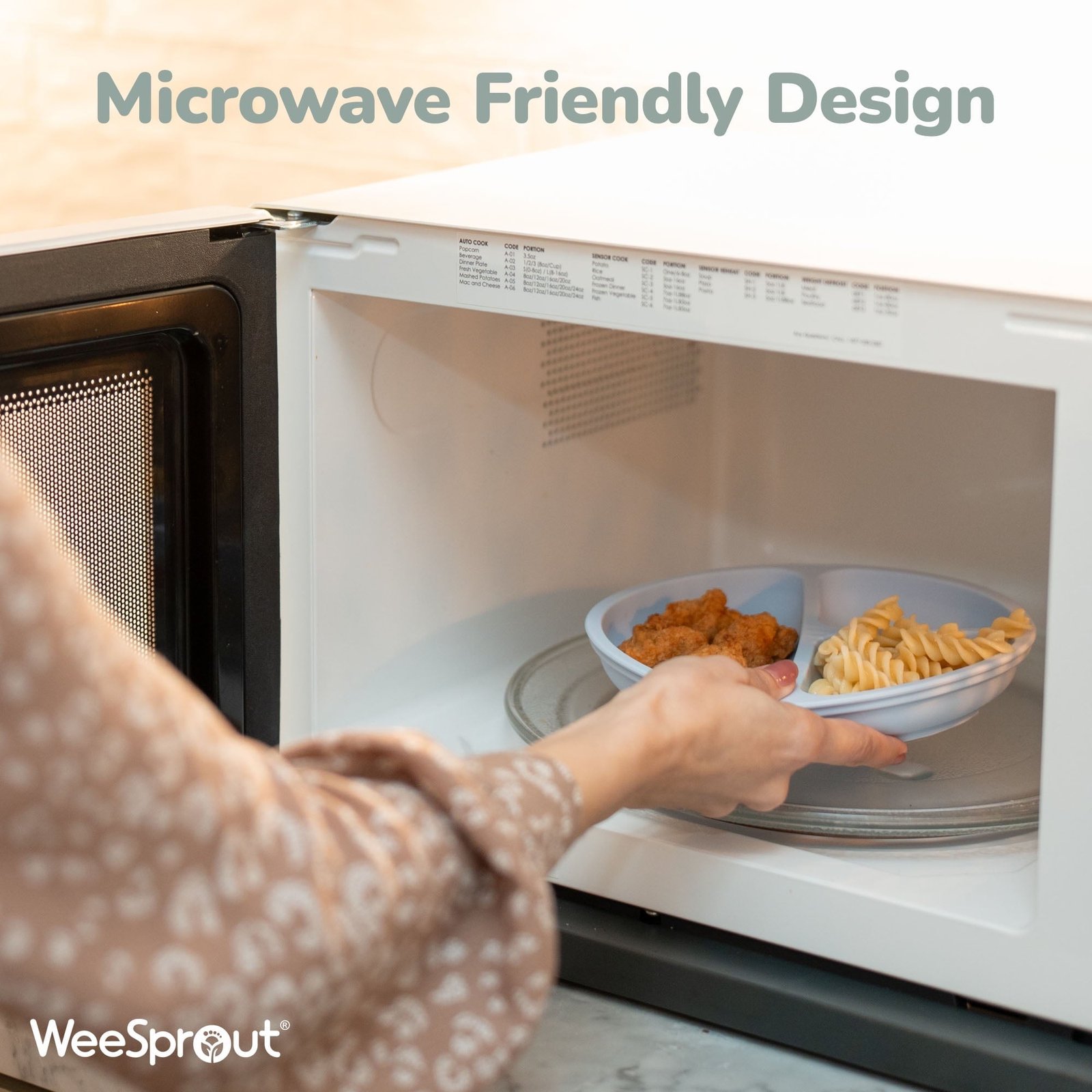 Our food grade silicone plates are completely filler-free! Unlike plastic plates, our plates never leach harmful materials into your child’s food. Plus, the toddler-proof silicone is unbreakable – they’re perfect for when your child learns to throw at the table! A four-point suction feature keeps your child’s plate securely attached to whatever flat surface you place it on! This prevents messy spills for children learning to self-feed and stops your child from tossing their plate off the table. Your toddler gets to eat independently and you get to relax at mealtimes! The raised dividers of our toddler plates keep your child’s food separate – no more tantrums over peas getting mixed in with potatoes! Mealtime with picky eaters just got easier. Plus, the raised outer edge of the plate makes it easy for little fingers to scoop up food without making a mess or pushing food off the plate. This set of 3 silicone suction plates are a parent’s dream! They’ll be thanking you when their child learns to throw at the table or refuses to eat their food when their veggies mix with their meat. Choose from several fun colors for a gift they’ll love, use after use! Getting a toddler to eat their vegetables requires more than an ordinary plate. That’s why WeeSprout plates were designed by real parents who know what it’s like to feed a toddler. Our silicone plates contain no fillers or harmful additives. The unbreakable silicone stands up to throwing, tossing, and tantrums. The suction feature is ideal for babies and toddlers learning to self-feed – simply secure the plate to the table and let your toddler feed themselves without worrying about plates being knocked or thrown off the table. The divided design keeps different foods separate. They’re perfect for picky eaters! Mealtime with your little one can shape the way your child eats in the future – WeeSprout plates make mealtime a positive experience!